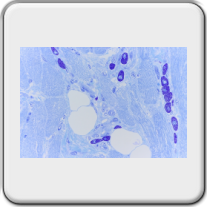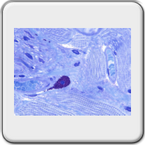 Nissle substantie in motorische neuronen, cresylvioletacetaat kleuring. Meer informatie is te vinden in de preparaatbeschrijving.