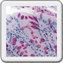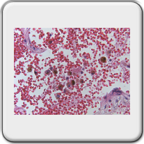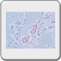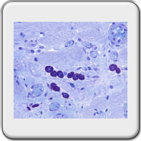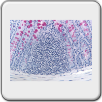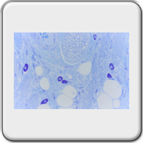 Gegranuleerde mestcellen in tong van een muis. Meer informatie is te vinden in de preparaatbeschrijving.