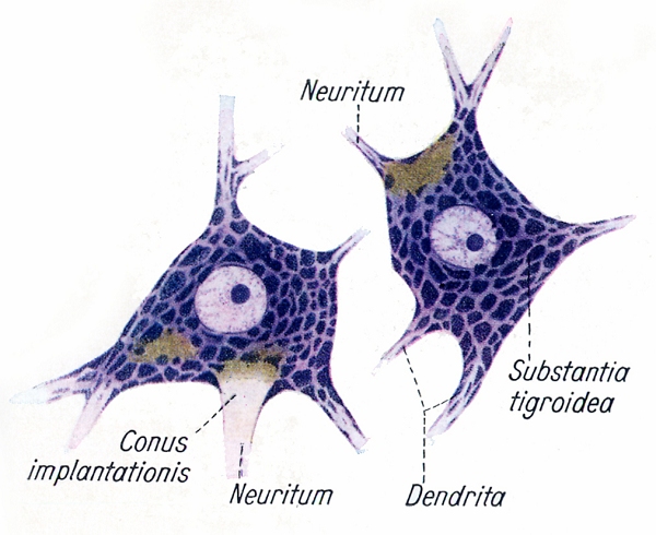 ...van Max Clara, Kurt Herschel en Helmut Ferner, staan diverse neuronen getekend weergegeven. Hier zijn de bedoelde Nissl lichaampjes of 'substantia tigroidea' duidelijk zichtbaar.