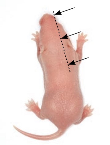 Saggitale zoombare coupe van een 5 dagen oude muis.