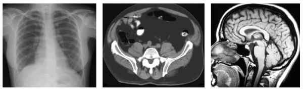 Links: röntgenfoto van de thorax in het frontale vlak; midden: CT-scan van het abdomen in het transversale vlak; rechts: MRI-scan van de hersenen in het sagittale vlak.