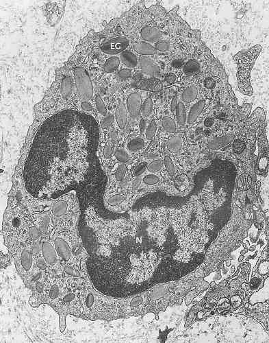 Het heeft een karakteristieke tweelobbige kern. ER, mitochondriën en Golgi-apparaat zijn in de rijpe cel weinig ontwikkeld. In het cytoplasma zitten grote ovale specifieke granula (200 per cel) die sterk met eosine kleuren. Het internum bevat het major basic protein (MBP), dit vormt 50% van het totale eiwit van de granula. Het speelt een belangrijke rol bij het doden van wormen en parasieten. Eosinofielen zijn van belang bij het fagocyteren en opruimen van antigeen-antilichaamcomplexen die zijn gevormd als onderdeel van een allergische reactie.