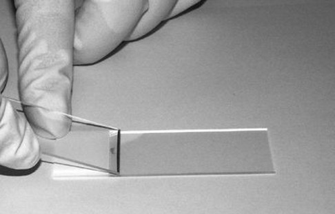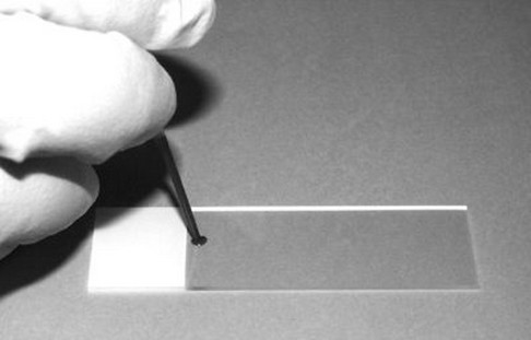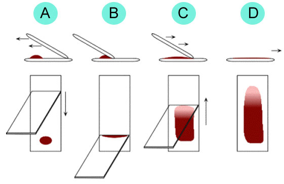 Onderstaande tekening geeft aan hoe een druppel bloed uitgestreken wordt op een objectglaasje. Belangrijk is dat het bloed door het tweede objectglaasje wordt meegetrokken en dus niet voortgeduwd, anders zouden alle bloedcellen kapot gedrukt worden. Het voortbewegen van het glas moet vrij snel gebeuren maar vooral met een éénparige snelheid. Zo kan een dunne laag worden verkregen. De beste plekken om te bekijken zijn de randen en de vlag (laatste deel van de uitstrijk).