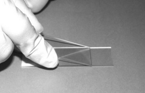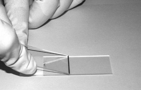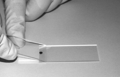 ![]() | Tweede objectglas aanbrengen en langzaam tegen de druppel aanschuiven. |