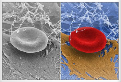 TEM opname van een erytrocyt. Links origineel, rechts ingekleurd met Fotoshop.
