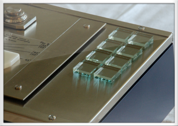 The rear glass holder clamps the glass square, under slight spring pressure, between the front and rear glass holders.