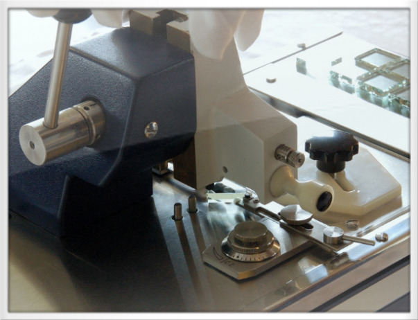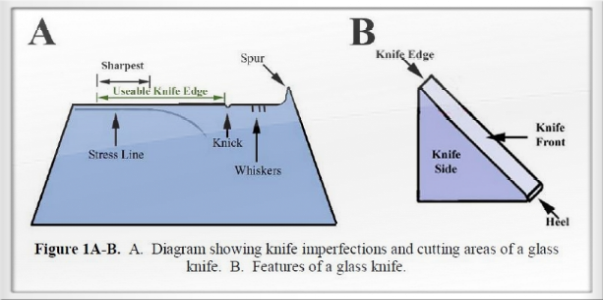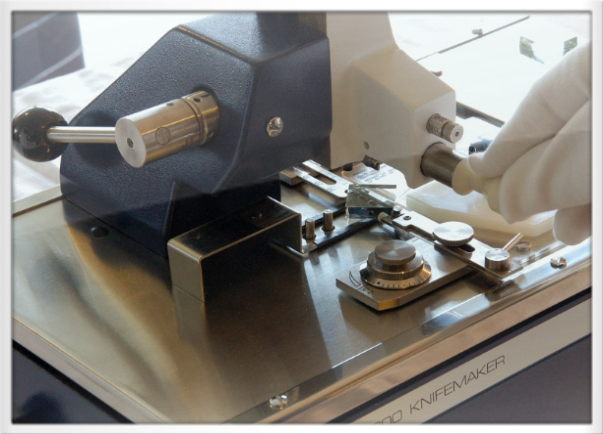 A glass knife with waterboat mounted on an ultramicrotome.