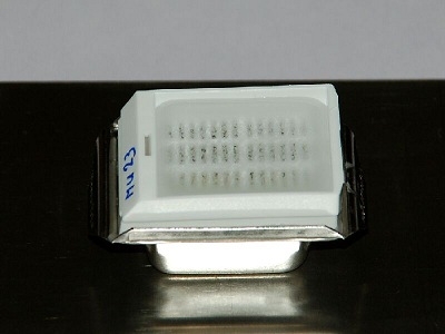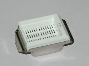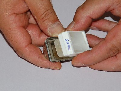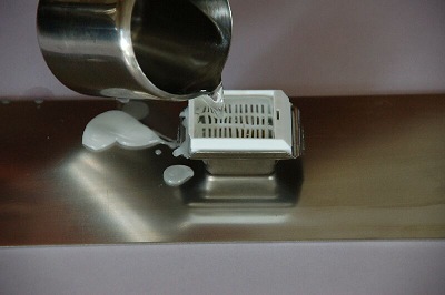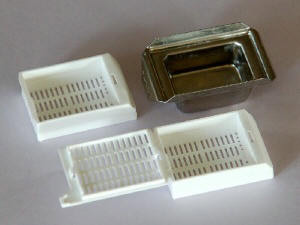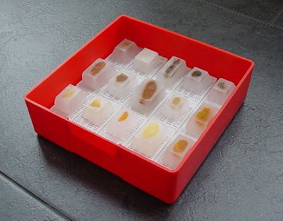 The tissues are now ready to be molded into blocks. An old-fashioned, but still widely used method is casting in a ring of aluminium after which the block is stuck onto a block of wood with a warm knife. On this site only stainless steel moulds will be used which will fit the cassettes exactly as described above. Because paraffin solidifies quickly, all materials must be ready for use. The tissue to be molded is best placed in a warm watch glass. The mold is placed on a steel plate. This is to allow the paraplast to cool down quickly. Fill the mold with a layer of paraplastic. Quickly position the tissue in the already coagulating paraplast. There is only a few seconds here to align. Warm tweezers can be beneficial here. The mold is filled with liquid paraplast up to the first edge. Place the cassette on the mold and fill it with paraplast. Soon the paraplast will start to solidify. Preferably place the hot mold in a cold environment (refrigerator). The faster the paraplast cools the smaller the paraffin crystals are, which improves the cutability.