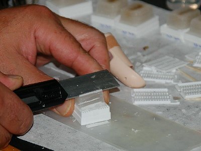 Paraplast shrinks quite a lot and that's why there is a shrinkage drop in the cassette. This is fine. After about fifteen minutes everything is cured. Because the paraplast has shrunk it will fall out of the mold very easily. Now the block can be finished. Cut away the spouts and if necessary shrink the block. Not necessary, but practical. The paraplast can be reused again and all paraplast that is in a cut has to be dissolved later in xylene. There must be enough paraplast to keep the tissue in place to keep it strong enough. Number the blocks and archive them. They can be kept for years.