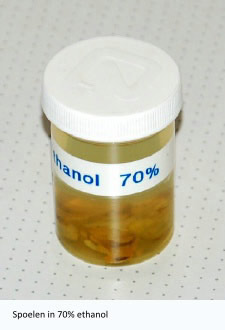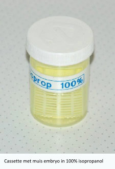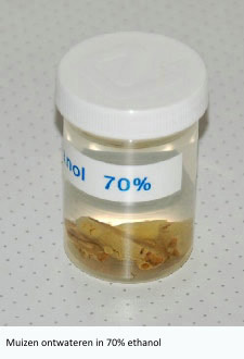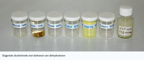 As previously described, the tissue must be molded into paraffin to cut it properly. In order to get the paraffin into the tissue down to the cellular level, all the water must first be removed from the tissue. This dehydration takes place in a rising alcohol series. The series is necessary to gradually remove the water from the tissue, if it goes too fast it affects the tissue structure. Many types of alcohol series have been developed that all meet the requirements. The series used by the author is based on ethanol and isopropanol, which are easy to obtain. The series is: 50%, 70%, 85%, 95% and 100%. Especially the absolute ethanol is quite expensive to buy and is hygroscopic. The absolute isopropanol is cheaper and works fine. The tissue stays in each bath for 12 -24 hours depending on the size.