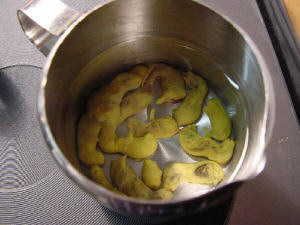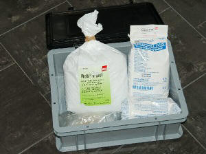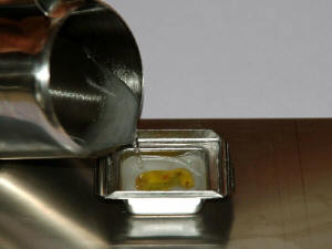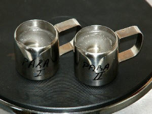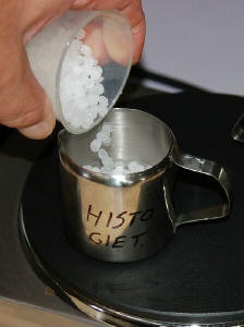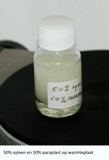 After all the water in the step 100% isopropanol has been removed from the tissue, the tissue is molded into paraffin. Before this is possible, an intermediate step (intermedium) must be made because isopropanol does not want to dissolve in paraffin. This step can be made with xylene or xylol. There are several substances that can act as intermedium such as: aniline, benzol, chloroform, isobutyl alcohol (butanol), tetraline, toluol, trichloroethylene, xylol and so on [2]. All these substances dissolve in both isopropanol and paraffin. The link page lists companies where the substances can be ordered. The tissue must remain in the xylene for 12 hours for small pieces and 24 hours for larger pieces. The pieces of tissue will look a bit glassy after this step (this is normal). After the intermedium step follows a step with a heated solution of 50% xylene and 50% paraffin. This step should take 24 hours for small pieces and 48 hours for larger pieces [2].