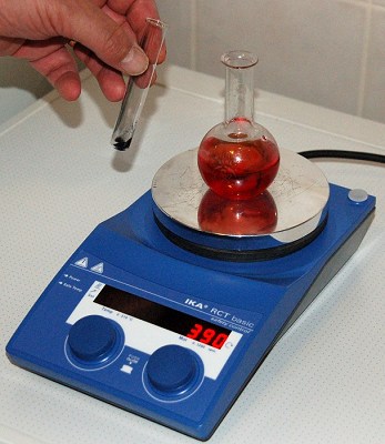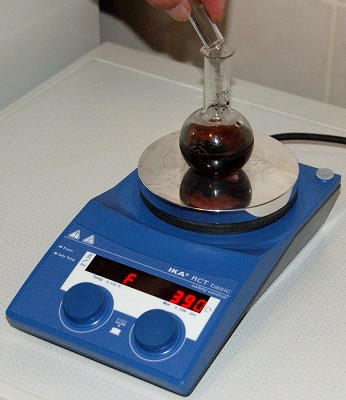 On a magnetic stirrer, add the weighed activated carbon to the solution (do not heat the solution).