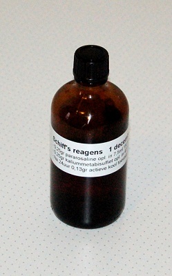 Schiff's reagent is used in, for example, the 'Feulgen reaction' or in the 'PAS' staining. Both are histochemical staining. In the Feulgen-reaction DNA is coloured and in the PAS (Periodic Acid-Schiff) colouring glycogen and other polysaccharides (carbohydrates) are used. The reagent can be bought ready to use but is quickly subject to decay and it is quite expensive.