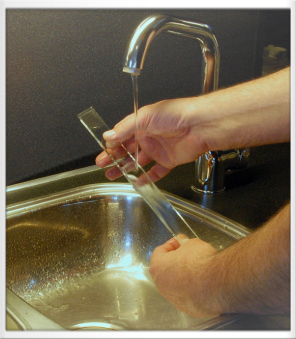 Carefully rub the glass strip with cheap soap (soap without all kinds of additives) and wash and rinse thoroughly. Pay special attention to the sides of the strip because that is where the knife edges will be. Rinse with AD and dry with tissue. From that moment on, wear gloves to prevent the glass from becoming greasy again.