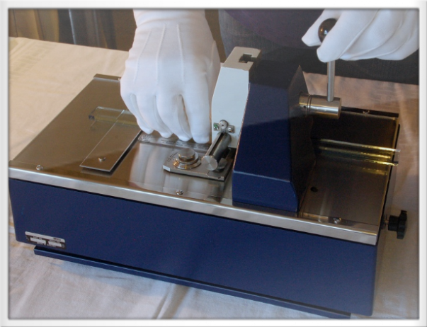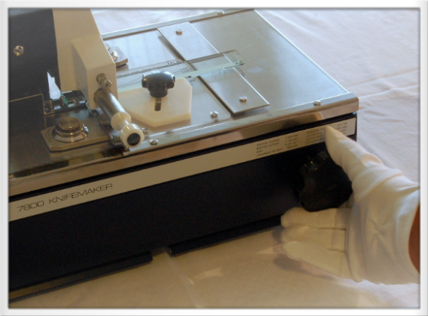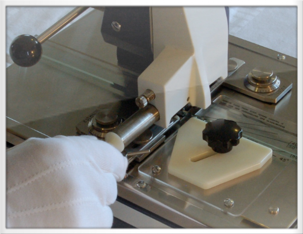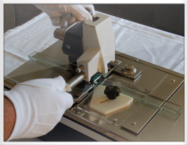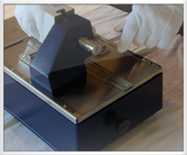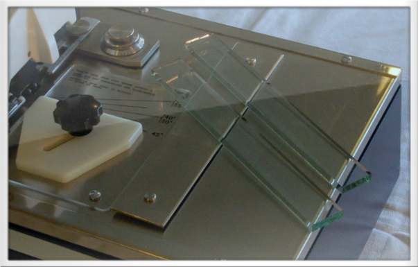 After cleaning the glass strip with e.g. Teepol, the strip is stretched in the LKB 7800 and glass squares are broken by zips with a cutting wheel. Then these squares are zipped diagonally and two knives are broken. A knife has a sharp side of high quality and a blunt side (foot).