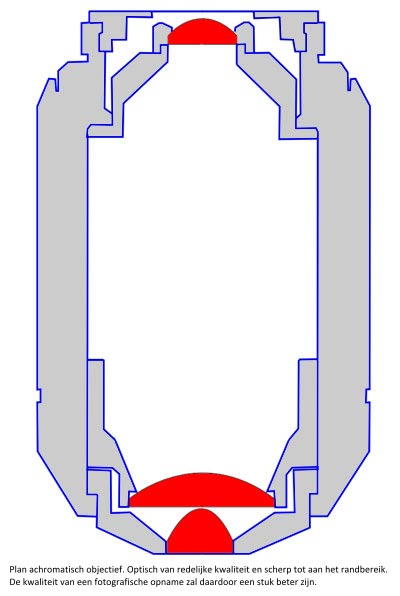 factor come close to very close to the specimen cover glass (e.g. a Leitz 63x Planapochromate has a working distance of 0.15mm[1]). To prevent damage to the front lens, these objectives have a spring-loaded mechanism that allows the front part to slide telescopically inwards when contact is actually made with the cover glass. Objectives can be divided into different categories due to their constructive way. So there are: Achromates, Apochromates, Fluorites, PlanAchromates and PlanFluorites[3]. Achromatic objectives have been corrected for two colors and do not give a sharp image all the way to the edge. These objectives are quite simple in construction and therefore relatively inexpensive. The planAchromatic has the same color correction, however, with an extra lens the entire field of view is sharp. This is particularly important for micro photography. The Apochromatic objective is corrected for three colors and has a high Numerical Aperture due to many lenses of high quality glass types which creates a high dissolving power. PlanApochromatic objectives are also corrected for planity and therefore very suitable for microphotography. Of course these objectives are expensive to very expensive. The Fluoriten and PlanFluoriten are regularly called half Apo's in the microscopy world. The quality is between the Achromates and Apochromates[3]. Click on the schematic image below for an enlargement.