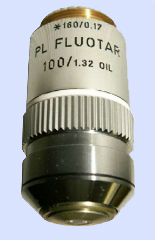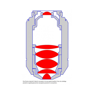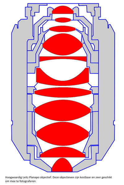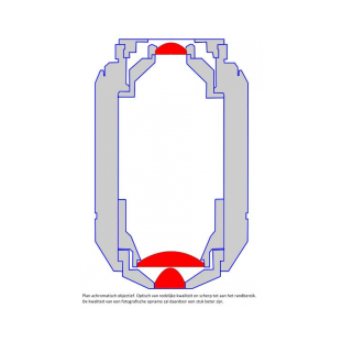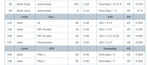 When purchasing a microscope, a choice must also be made in the objectives to be purchased. The whole must be in balance. It is not useful to equip a very simple microscope with top objectives because there should also be a good condenser, illumination, eyepiece et cetera. The opposite is also true, equipping a topmicroscope with simple achromatic objectives is of course possible, but it is a pity because with the microscope much more could be seen. For the hobbyist a new microscope with objectives of a top brand is usually not feasible as the price quickly goes up to €20.000,-. However, the second hand market is a good alternative. Experience shows that for older microscopes from Leica, Leitz and Zeiss there are still plenty of good objectives available in Europe. The market for Olympus and Nikon microscopes is much smaller. When objectives are bought from a dealer, the objective can be judged on the spot, but has the big disadvantage that usually a hefty price has to be paid for it. Take your time for the evaluation. At e.g. ABRO in Zaandam (see also under links) the prospective buyer gets the chance to test the objective itself extensively. Preferably bring your own samples.