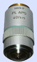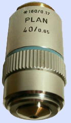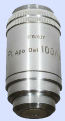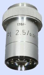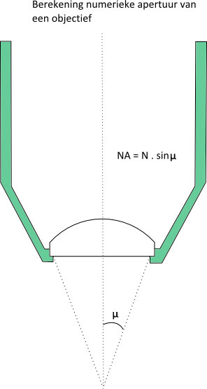 factor come close to very close to the specimen cover glass (e.g. a Leitz 63x Planapochromate has a working distance of 0.15mm[1]). To prevent damage to the front lens, these objectives have a spring-loaded mechanism that allows the front part to slide telescopically inwards when contact is actually made with the cover glass. Objectives can be divided into different categories due to their constructive way. So there are: Achromates, Apochromates, Fluorites, PlanAchromates and PlanFluorites[3]. Achromatic objectives have been corrected for two colors and do not give a sharp image all the way to the edge. These objectives are quite simple in construction and therefore relatively inexpensive. The planAchromatic has the same color correction, however, with an extra lens the entire field of view is sharp. This is particularly important for micro photography. The Apochromatic objective is corrected for three colors and has a high Numerical Aperture due to many lenses of high quality glass types which creates a high dissolving power. PlanApochromatic objectives are also corrected for planity and therefore very suitable for microphotography. Of course these objectives are expensive to very expensive. The Fluoriten and PlanFluoriten are regularly called half Apo's in the microscopy world. The quality is between the Achromates and Apochromates[3]. Click on the schematic image below for an enlargement.As already described in Microscopes, the exposure, the objective, the brightness and the resolving power are the four most important criteria that determine the quality of the image. The resolving power of a microscope (the resolution) is defined as the smallest distance at which two points are just separated. The resolving power depends mainly on the objective, to a lesser extent on the condenser, while the eyepiece does not contribute much. Image quality is determined by the color reproduction, transparency, contrast and resolution of the objective, while specimen properties are also important. Good image information is obtained when magnification and resolution are balanced. When higher magnification is not accompanied by higher resolving power, this results in meaningless magnification. A very important specification of the objective lens is the numerical aperture (NA), which is mainly determined by the top angle of the cone of light that can be captured by a lens. In the formula used to calculate the NA, the half aperture angle of the light cone (µ) is multiplied by the refractive index (N) of the medium between lens and specimen[2]. Theoretically, the NA of a dry lens (a lens that does not use immersion oil) can never be higher than 1.0. Since the refractive index of air is 1, the aperture angle of the lens should be 180° and the front lens is then infinitely large. Practically, these lenses reach a maximum NA value of 0.95. With oil immersion lenses, however, a higher NA can be achieved. The refractive index of this oil is 1.515. The maximum achievable NA is now 1.4.