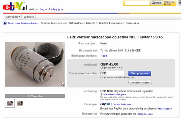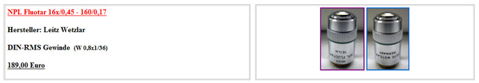 The very popular objectives such as the Leitz 63x Planapo Öl with a NA of 1.4 are also expensive on ebay (≈ €400,-) but cost new €3000,-.