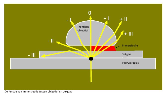 The left side of the image below shows what would happen to the light when a dry lens with a large aperture angle is brought close to a cover glass. Light beams - || and - ||| will not reach the lens. The high numerical aperture would be useless and therefore there is no high resolving power. Immersion oil is applied on the right side (red). An objective with a high numerical aperture (from 1.0) can only be used in combination with immersion oil. The light beams are now absorbed by the objective and now the higher resolution can be used almost completely. These objectives always bear the name Öl, Oel or Oil in their inscription.