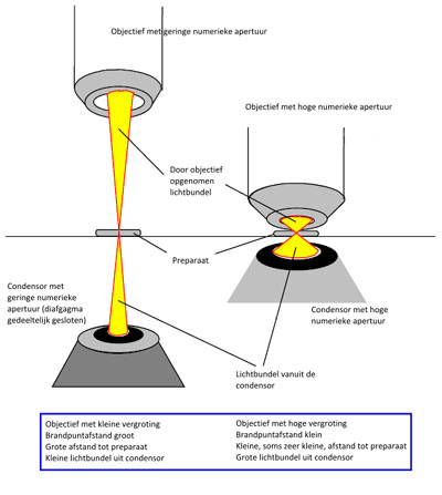 The diagram below shows the difference between low and high aperture objectives.