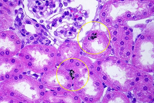 In deze coupe zijn twee zwarte kwikzilver-kristallen zichtbaar (gele circels).