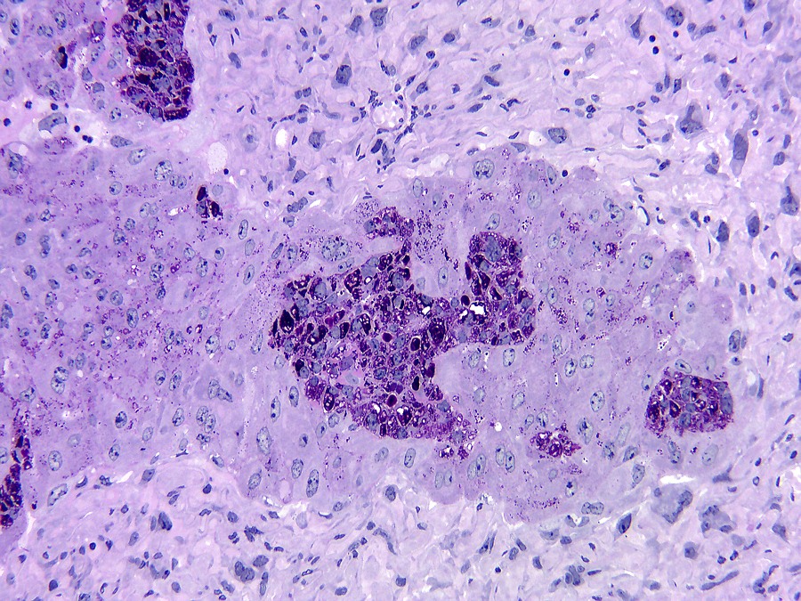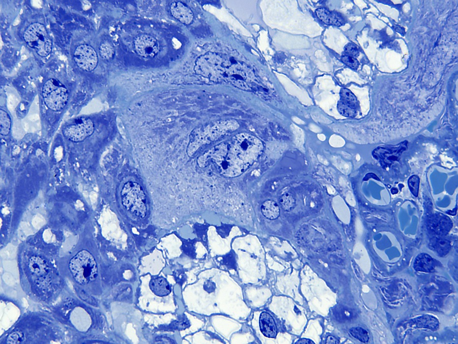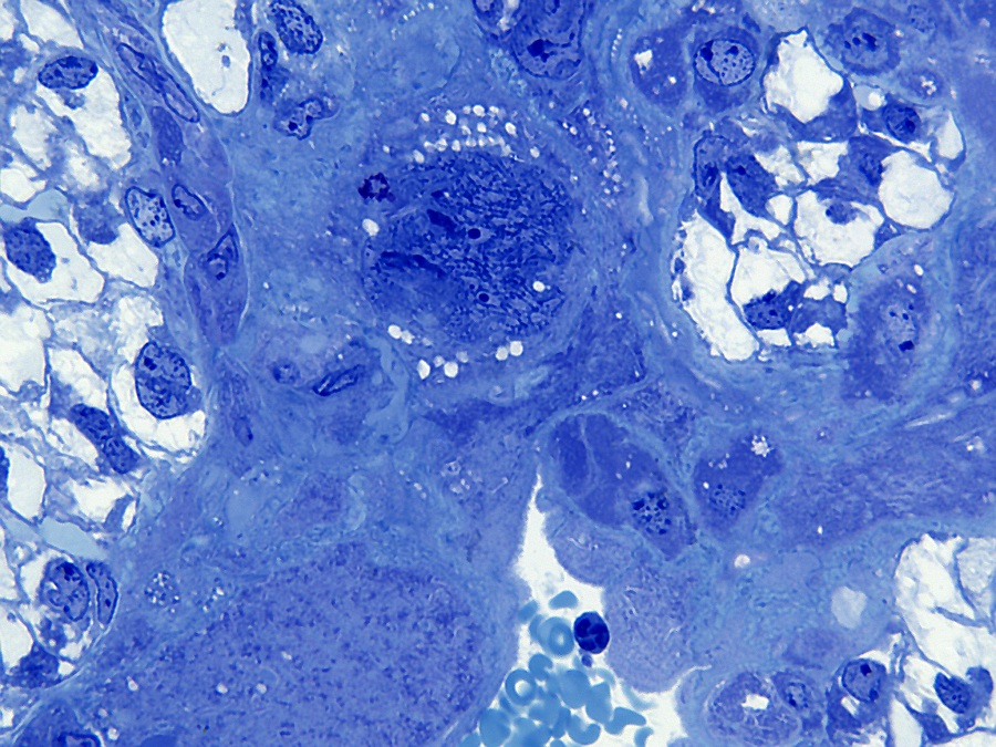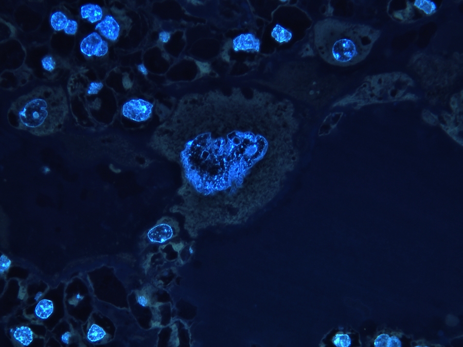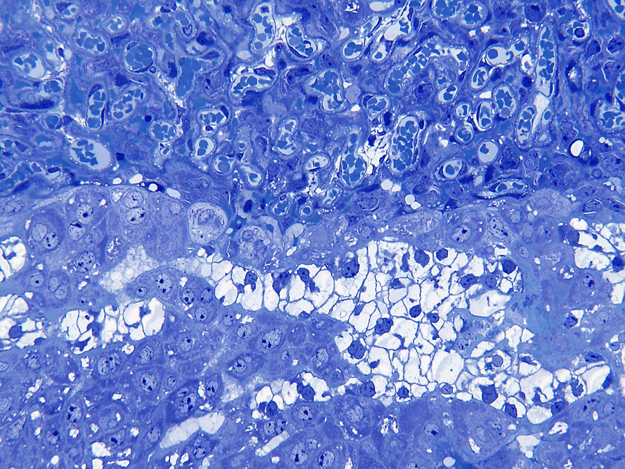 inbedden in Technovit 7100 en de trofoblast reuscellen zichtbaar maken.