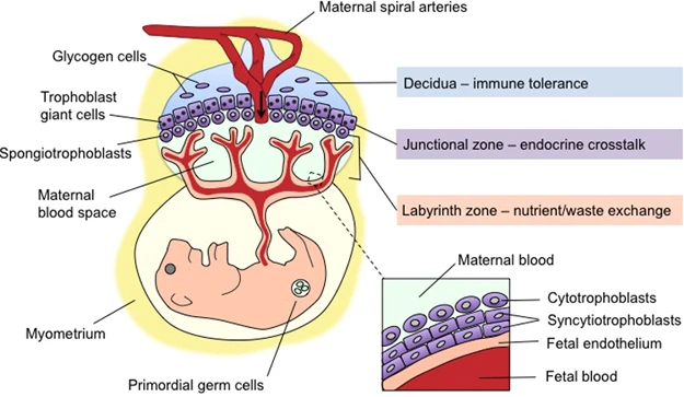 De decidua wordt van de embryonale labyrintische zone gescheiden door de junctionele zone. De junctionele zone bevat maternale bloedvaten (veneuze drainage), trofoblastreuscellen en spongiotrofoblastcellen. Trofoblastcellen zijn over het algemeen erg groot met bizar gevormde of meervoudige kernen. Reusceltrofoblasten zijn, zoals hun naam al zegt, erg groot - tot 100 µm in diameter en bevinden zich het dichtst bij de decidua. Spongiotrofoblasten zijn fagocytisch[6] en kunnen gefagocytiseerde erytrocyten bevatten en bevinden zich dichter bij de labyrintische zone. De labyrintische zone bestaat uit nauw tegenover elkaar liggende foetale en maternale bloedkanalen. De foetale bloedkanalen zijn bekleed met dunne endotheelcellen en bevatten grote onrijpe gekerfde rode bloedcellen, terwijl de maternale bloedkanalen bekleed zijn met grote labyrintische trofoblastcellen.
