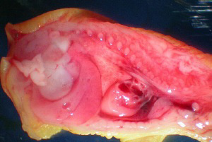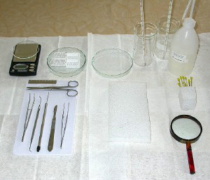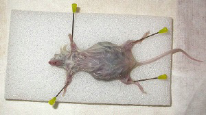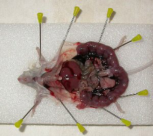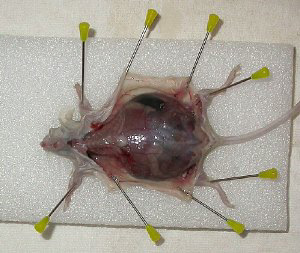 Het doden van kleine dieren, zoals hier een muis, gaat eenvoudig met het toedienen van een met ether doordrenkt bolletje watten in een afgesloten bakje. De gedode muis wordt even ondergedompeld in 50% ethanol. Dit om sterieler te werken en om te voorkomen dat er tijdens de incisie haren mee naar binnen worden genomen. De muis wordt met naalden netjes op een stuk stevig schuim opgespannen. Draag de gehele periode plastic handschoenen om mogelijke bacteriebesmettingen te voorkomen. Maak allereerst een oplossing van 9 gram keukenzout (Natriumchloride) in 1 liter water. Deze oplossing wordt "fysiologische zoutoplossing" genoemd. Deze stemt redelijk overeen met de "zoutheid" van weefselvocht. Organen en weefsel kunnen ermee gespoeld worden. Gebruik nooit kraanwater voor het spoelen van vers onderzoeksmateriaal. Door de grote verschillen in osmotische waarde zullen de cellen openbarsten. Gebruik een scalpel, pincet en een verbandschaar. Pak het vel van borst-