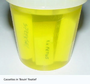 Nadat een orgaan is genomen moet het zo snel mogelijk in fixeervloeistof worden gebracht. Om alle weefsels overzichtelijk te fixeren kan gebruik worden gemaakt van fixeercassettes. Op deze cassettes kan met een watervaste stift een beschrijving worden aangebracht. Deze stap is noodzakelijk, omdat na het fixeren de meeste weefsels slecht herkenbaar worden (alles wordt bruin en lijkt op elkaar).
