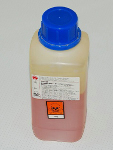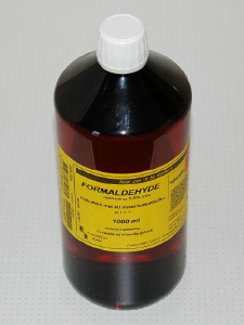 - Formaldehyde [1] is een stekend ruikend gas dat zich goed in water laat oplossen. De oplossing in water wordt formaline genoemd en bevat 37-40% formaldehyde (syn. formol)(vroeger heette het nog wel eens ‘sterk water’). De oplossing penetreert het weefsel goed en is ook geschikt om wat grotere stukken te fixeren. In tegenstelling tot alle andere fixatieven kan een stukje weefsel in formaline enkele maanden verblijven zonder dat de structuur duidelijk verandert. Willen we weefsel langer bewaren dan is het raadzaam om aan het formaline een klein brokje marmer toe te voegen. De reden hiervoor is dat onder invloed van zonlicht en stoffen die uit het weefsel trekken er spontaan mierenzuur gaat ontstaan. Als fixatief wordt meestal een concentratie van 4% formaldehyde (formol) in water gebruikt. Kijk op oplossingen voor een handige tabel.